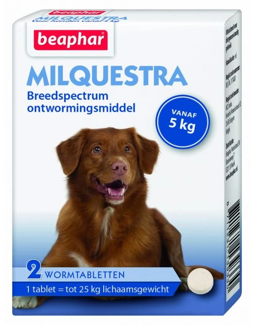 The Beaphar Milquestra Dog is a broad spectrum dewormer for dogs from 5 to 50 kg. The product is effective against tapeworms, hookworms, roundworms, whipworms, lungworms and eyeworms. In addition, it also provides prevention against heartworm disease.