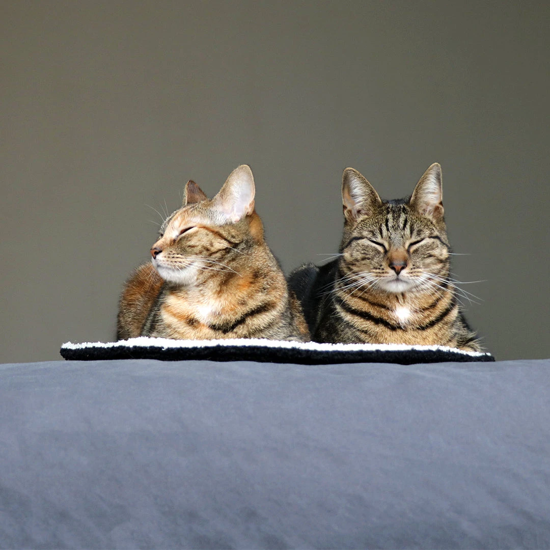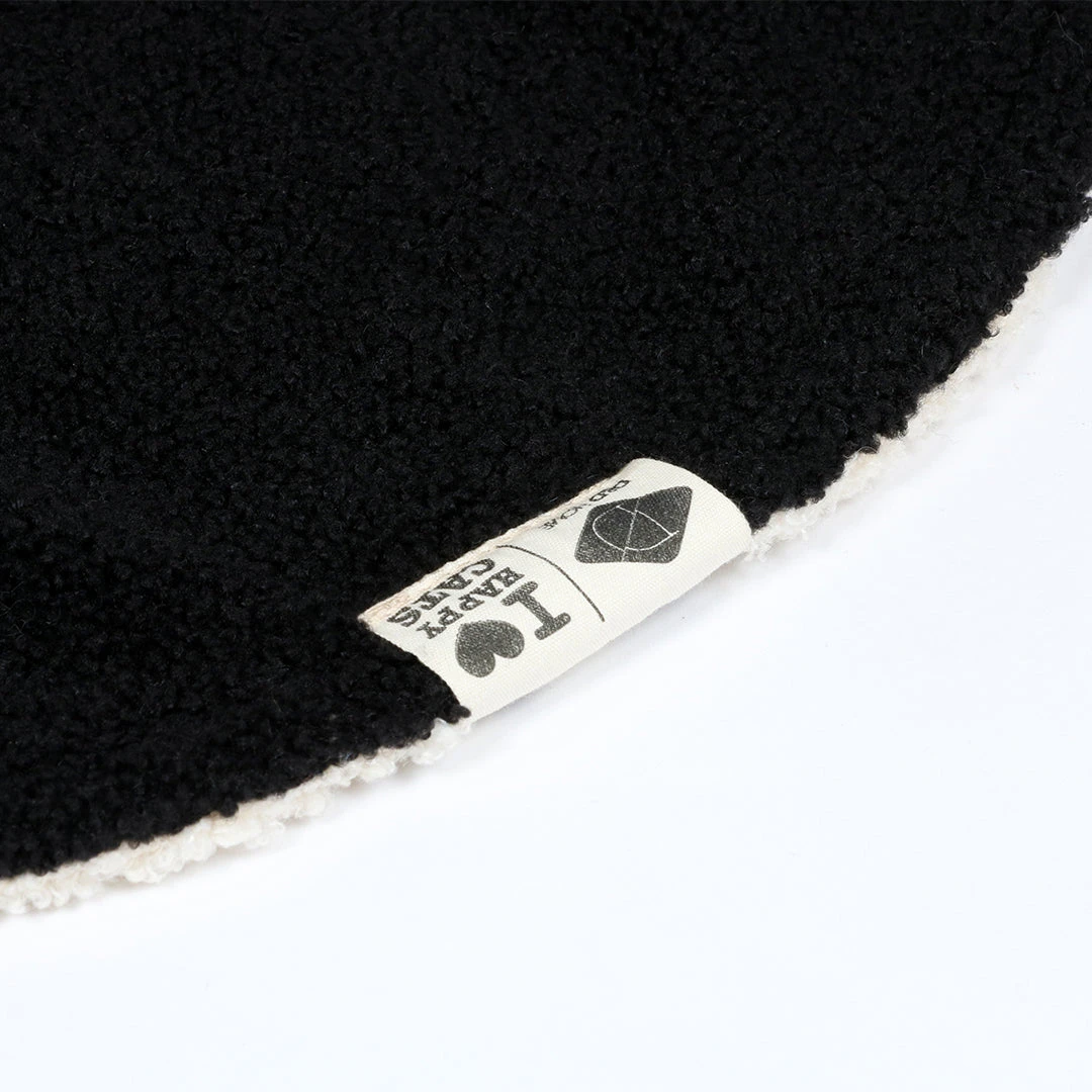 MAEVE by D&D Home | I LOVE Happy Cats created in collaboration with cat behaviourist Anneleen Bru, is a soft round plaid.. This plaid gives your cat the opportunity to have her own bed on top of your bed! It will help to keep cat hairs off the sheets and provide your cat with a safe and familiar place to sleep and rest. The round shape is perfect as cats tend to roll themselves into a beautiful round when they sleep :). Our maeve has a soft teddy fabric and has a flat surface because cats prefer to lie on a flat cushion instead of convex one. You can flip the plaid onto the white or black side. Happy Tip! You can also use the MAEVE on sofas, kitchen tables or other furniture. Your cat will love to have her own safe spot.