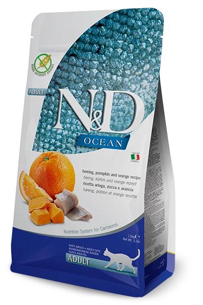 N&D Herring, pumpkin and orange recipe for adult cats is formulated to meet the nutritional levels established by the AAFCO Cat Food Nutrient Profiles for maintenance.