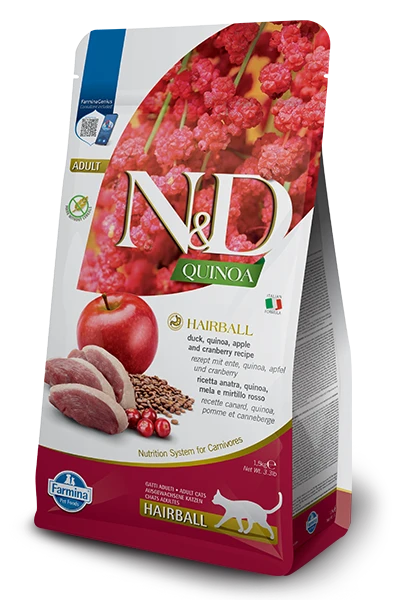 N&D Quinoa Hairball is a complete food for cats, indicated to favor the expulsion of hairballs. HAIRBALL – Duck, quinoa, apple and cranberry recipe.<br>Complete food for adult cats.