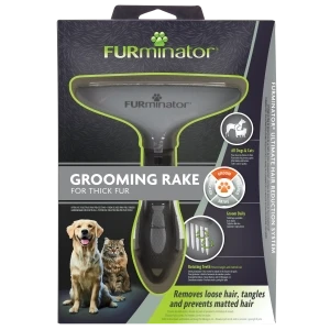 The FURminator® Grooming Rake removes loose hair from the undercoat and helps prevent tangles and felt spots thanks to the rotating metal teeth. It is ideal for dogs and cats with a thick coat or double coat. The ergonomic non-slip handle of the FURminator® Grooming Rake offers maximum control during use. Daily care helps keep your pet’s coat and skin in good condition.