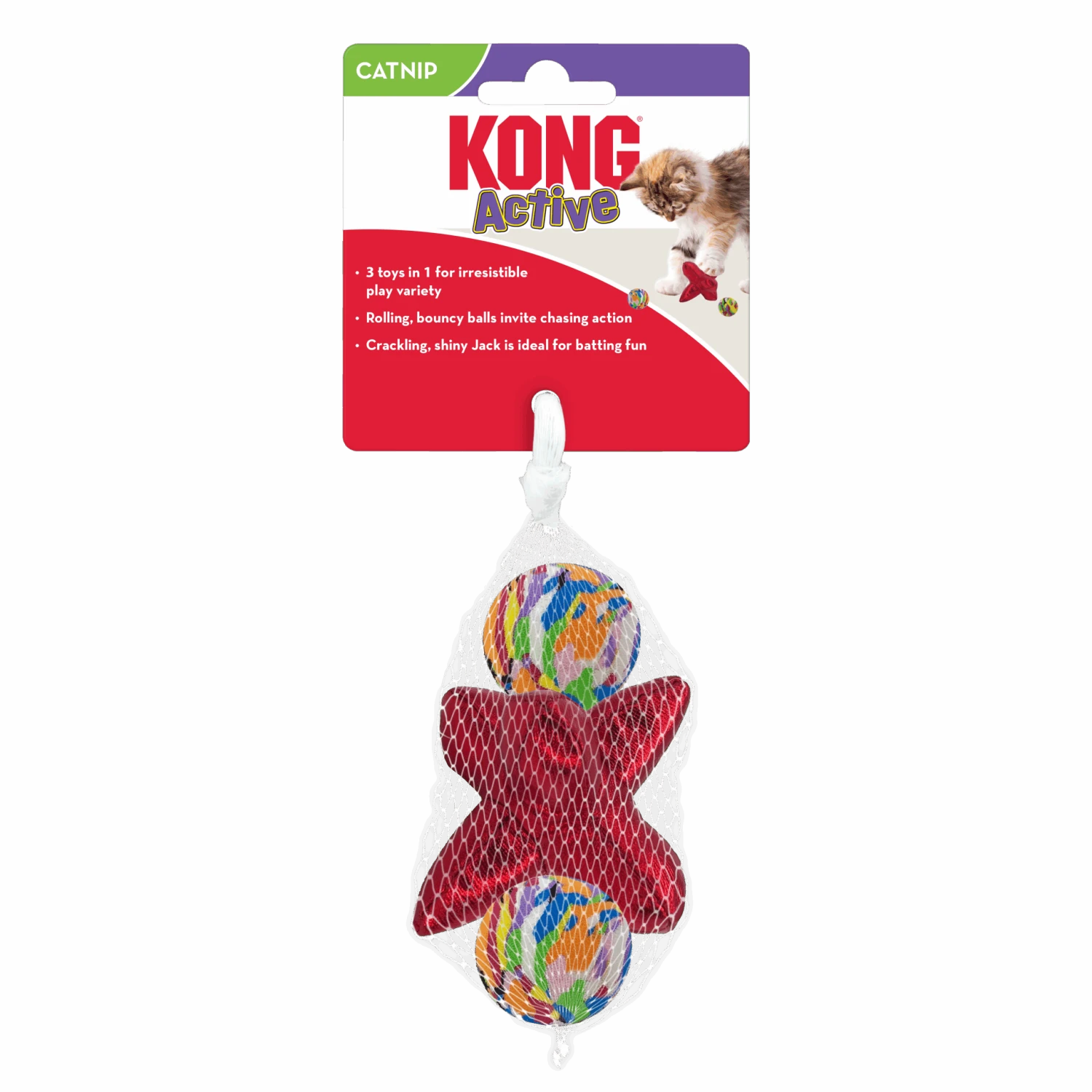 KONG Cat Active Jacks toss 3 toys into play with kitty-tempting spins on traditional fun in super lightweight toys that spark action. Fast-rolling, bouncy balls and easy-to-flip jack invite pouncing and batting play. KONG North American Premium Catnip and crackle in shiny Jack prolong engagement for tons of healthy exercise.