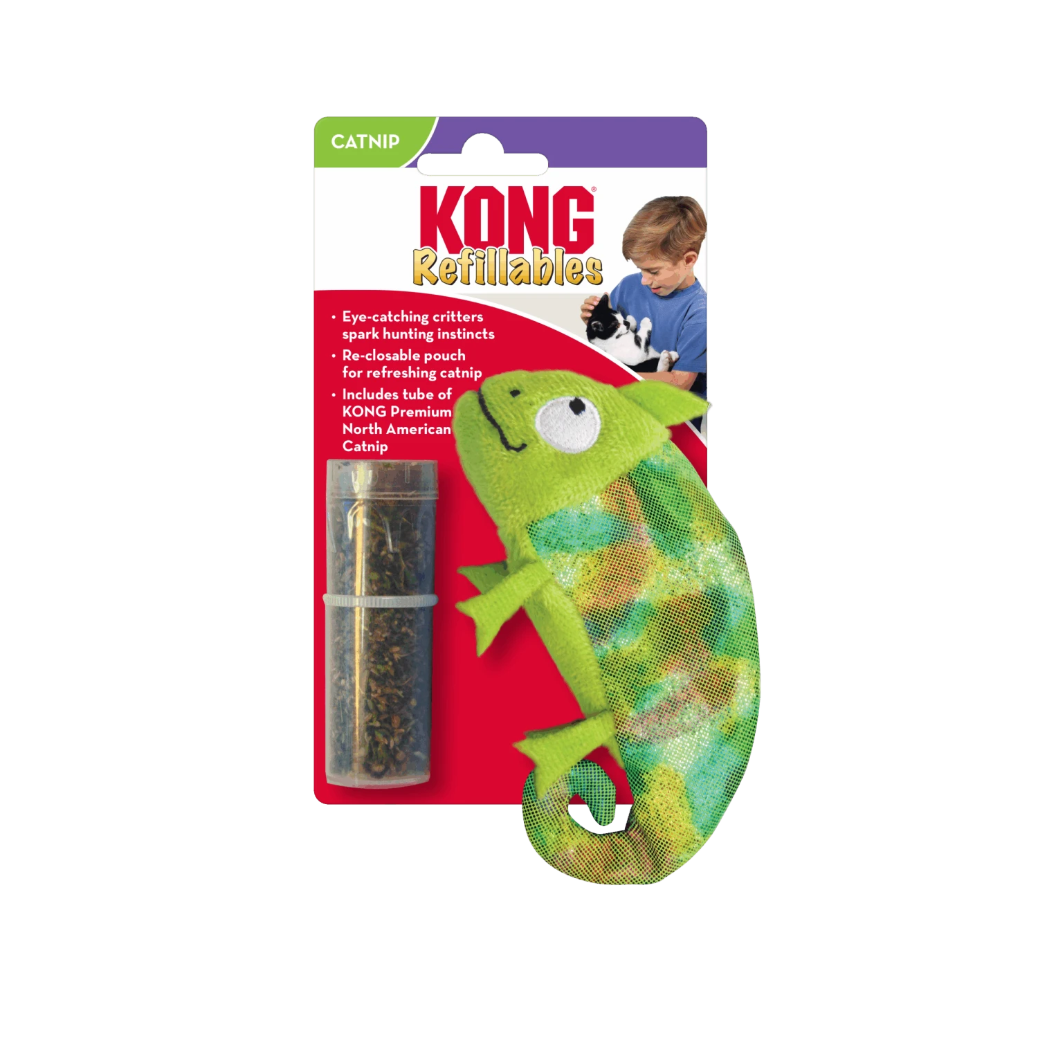 The resealable pockets of the eye-catching friends of the KONG Refillables Critter Collection allow you to replace the catnip for endless fun. The adorable and irresistible animals stimulate hunting instincts. Their lightness makes them ideal to touch and roll, while their little legs stimulate dragging. Tube of KONG Premium North American Catnip supplied.
