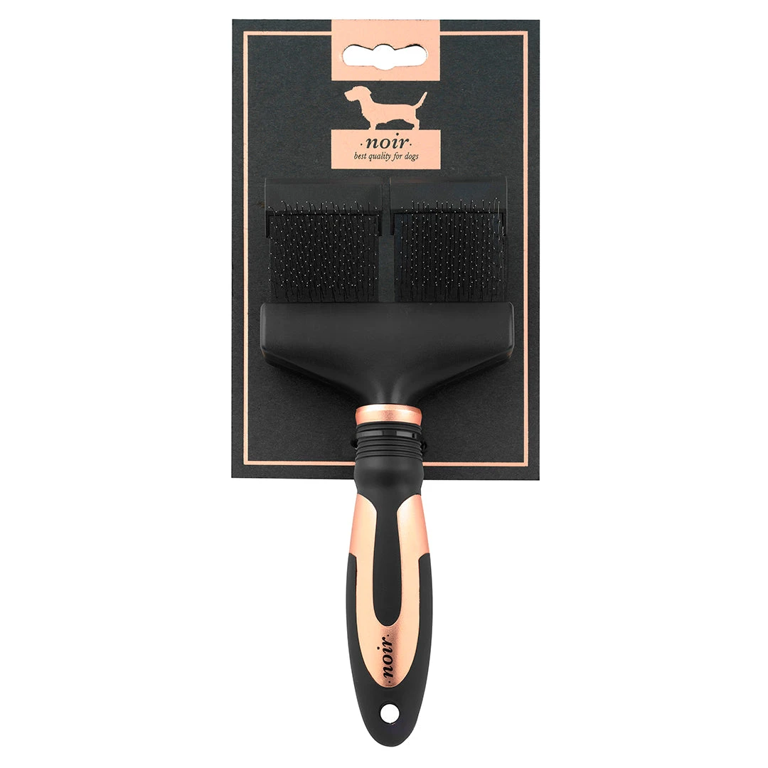 This flexible Slicker brush from Noir is made of soft stainless steel pins for effective removal of dead hair and dirt. The flexible head adapts perfectly to the body shape. The brush has straight pins on one side and curved pins on the other. The curved pins gently thin out the thick undercoat without irritating the skin and gently remove knots and tangles. The straight pins care for the coat and provide a natural shine. The ergonomic handle is made of sturdy ABS plastic for more comfort for the owner. The brush is suitable for all breeds of cat and dog.