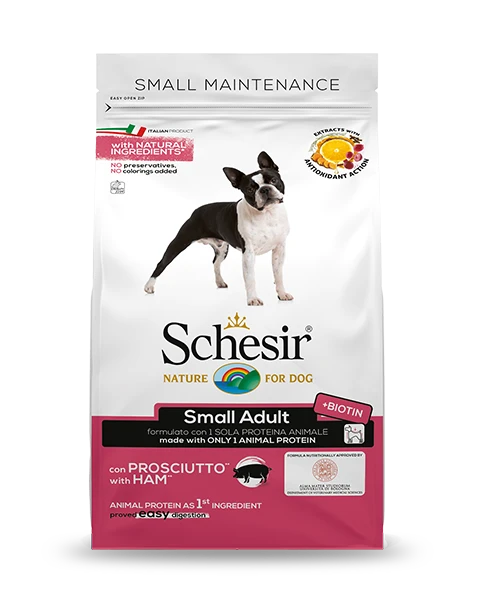 A Schesir recipe whose single animal protein source is pork (of which 6% ham): a delicious, complete and balanced food that’s easy to digest and meets the nutritional needs of adult small dogs of all breeds.