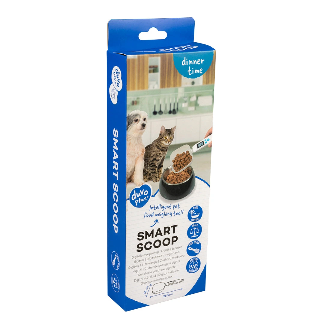 With the duvoplus Smart scoop you can both scoop and weigh food or snacks all in one. This is a super handy way to instantly measure out the perfect amount. This ensures you can easily keep track of your animal’s daily ration and that you do not feed your pet either too much or too little food. Ideal for limiting the risk of obesity! Thanks to the calculation function, you can combine different scoops or portions to calculate the desired weight. With a minimum weighing weight of 3 g/ml and a maximum of 300 g/ml, even larger portions for large dog breeds can be weighed. Made of maintenance-friendly ABS material, ideal for both dry and wet food and liquids. Batteries included.