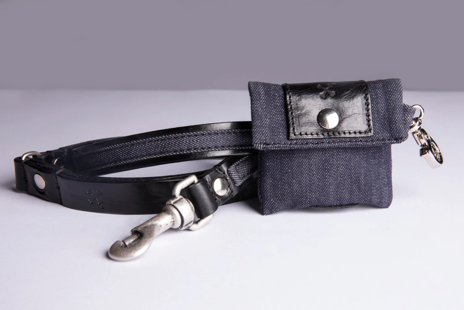 it comes in 2 variants, as all our matching products: raw denim & black leather with antique silver hardware or raw denim & cognac leather with antique gold hardware.