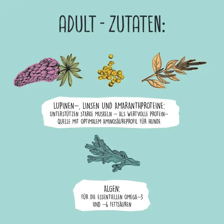 “Complete food” means it provides all the nutrients your dog needs for good health. This is very important for us, which is why we developed our wet food with veterinary specialists to create a formula that best suits your dog’s dietary requirements. In order to provide sufficient protein, we use lupin, lentil and pea proteins. These valuable sources of protein have the ideal amino acid profile for dogs, which for example strengthens your dog’s muscles. The added seaweed provides essential omega-3 und omega-6 fatty acids. Our ADULT wet food also contains our own specially developed mineral powder, which provides additional essential nutrients such as vitamin B12, taurine and carnitine.