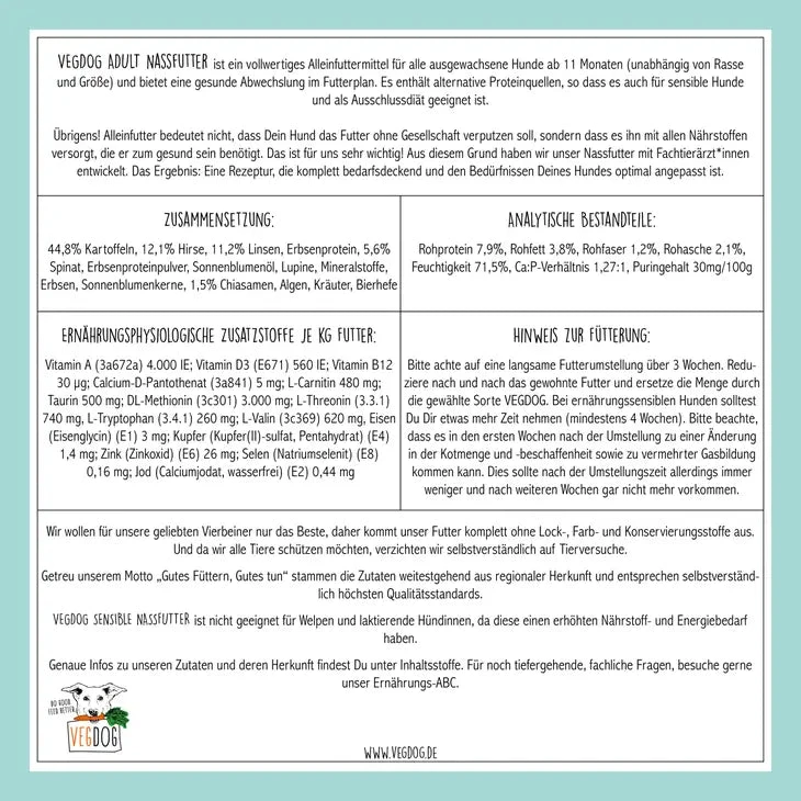 VEGDOG ADULT wet dog food is a complete food for all adult dogs 12 months or older (depending on breed and size) and provides healthy variety in your dog’s diet. It contains alternative protein sources, making it suitable for sensitive dogs and as an exclusion diet.